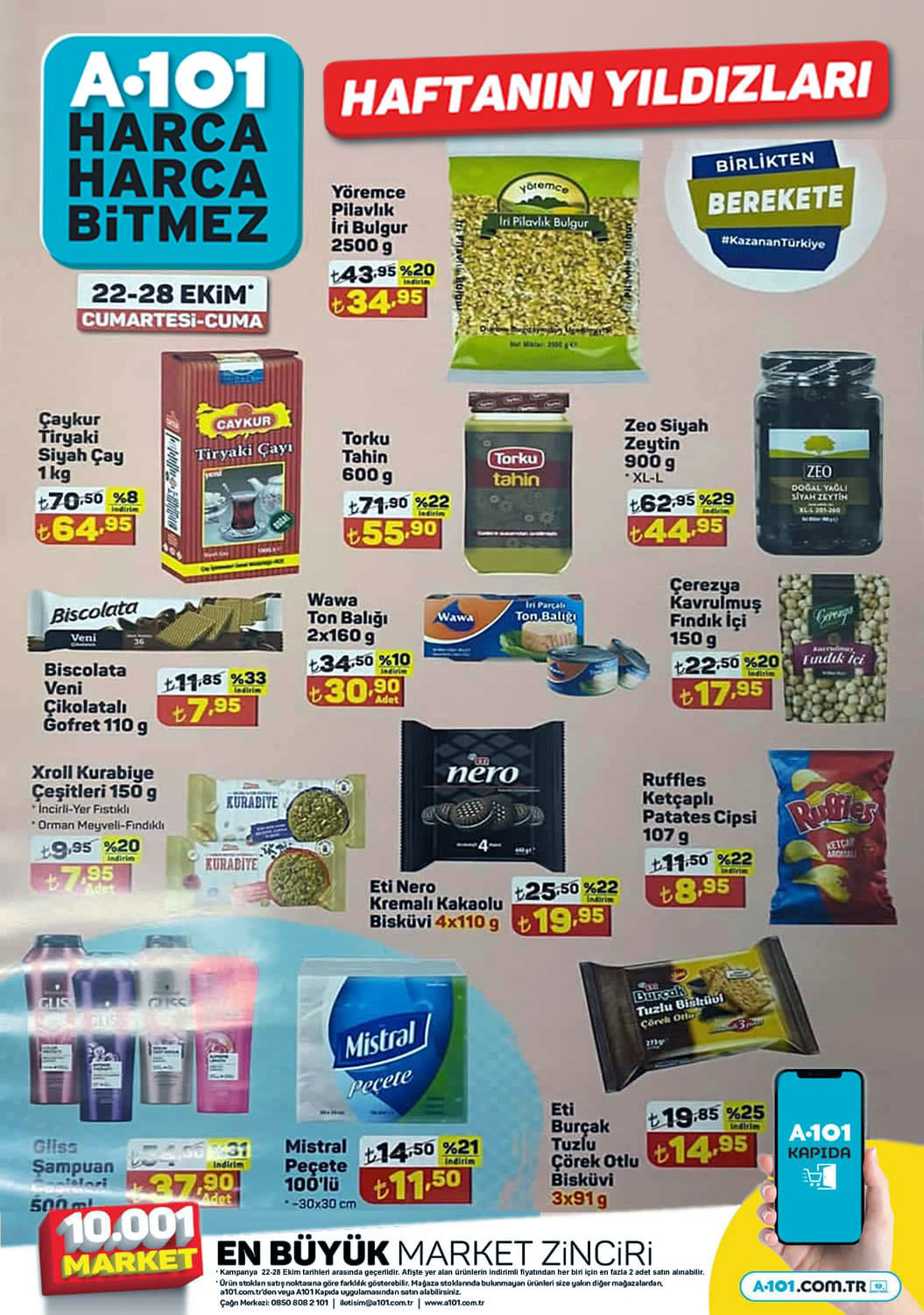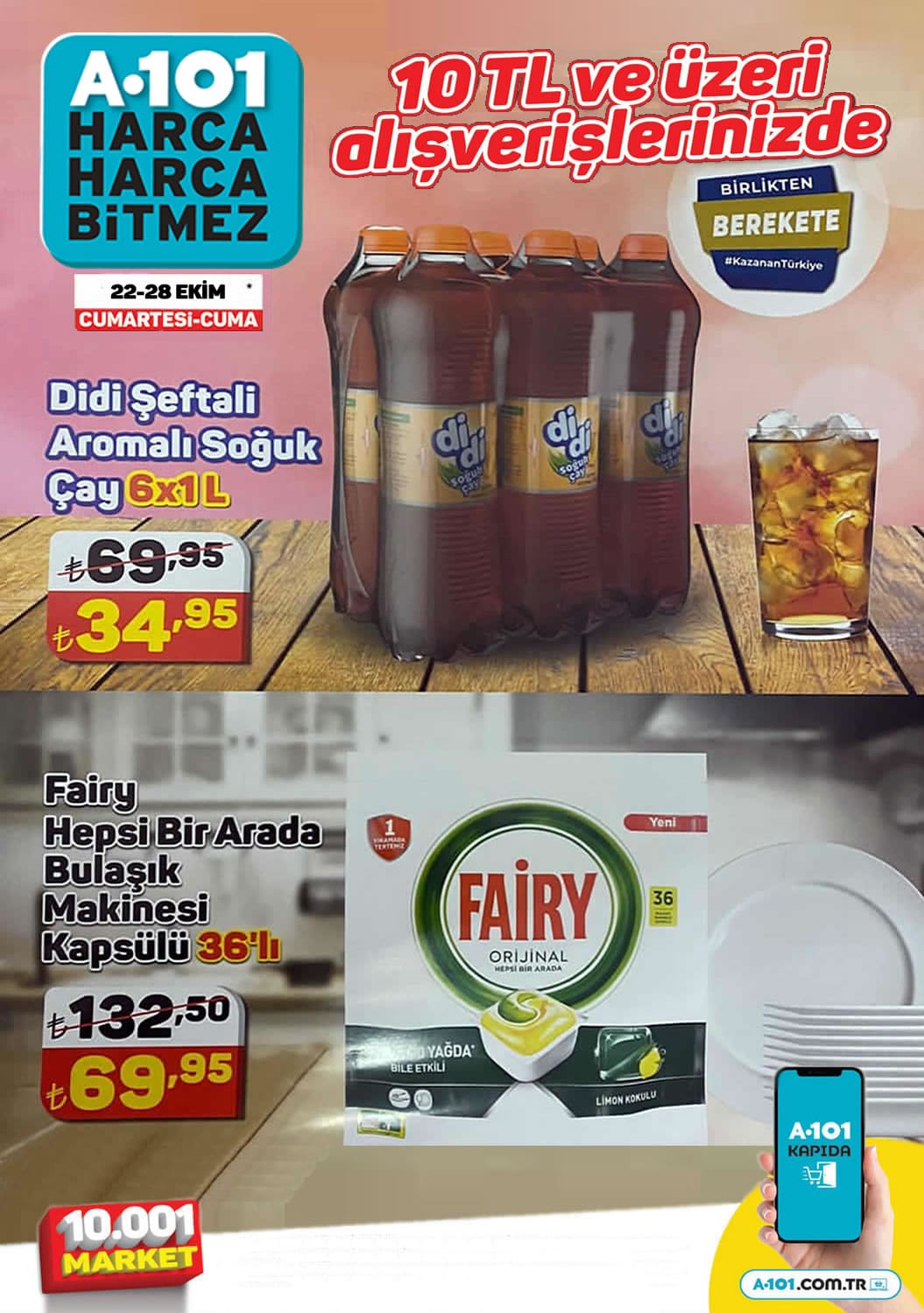 A101 marketlerde hafta sonuna hususi kampanyası kapsamında 22 Ekim 2022 tarihindeki haftanın yıldızları indirim kataloğunu inceleyebilirsiniz. Yoğurt, peynir, yumuşatıcı deterjan, içecek şeklinde birçok ürünü a101 mağazalarından indirimli alabilirsiniz. 10 ₺ ve üstü alışverişlerinizde didi içecek ve fairy deterjanda hususi fiyat fırsatı sizi bekliyor.